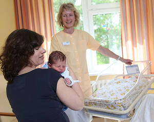 - Unterbringung in Zwei- und Einbettzimmern in familienfreundlichem Ambiente auf der Wochenstation mit integriertem Wickelplatz, Babywanne und Bad