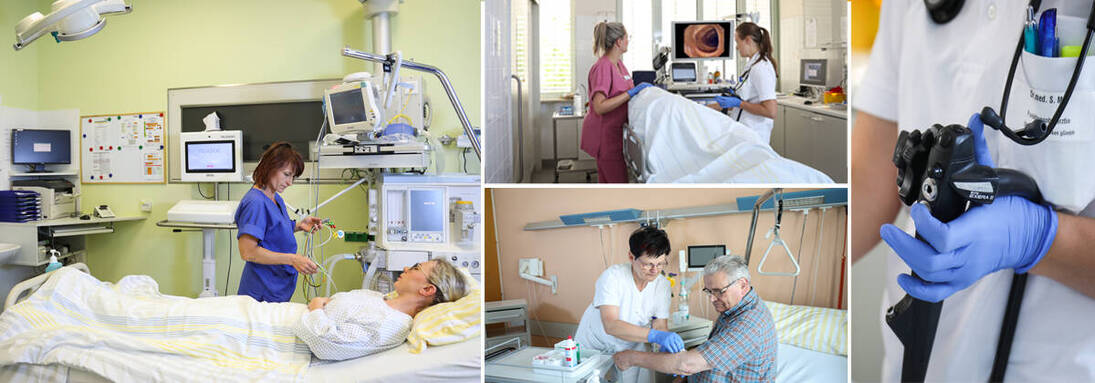In der interdisziplinär betriebenen Endoskopie-Abteilung erfolgen mittels flexibler, hoch auflösender Endoskope im Videoverfahren Magen-, Darm-, und Gallenspiegelungen mit therapeutischen Interventionen, Anlagen von Ernährungssonden, sowie Kehlkopf- und Lungenspiegelungen. Bei der endoskopischen Bestätigung von operationspflichtigen Diagnosen ist die sofortige Weiterbehandlung in der Chirurgischen Klinik gewährleistet. Außerdem besteht die Möglichkeit einer Untersuchung des Dünndarms mittels Kapselendoskopie.