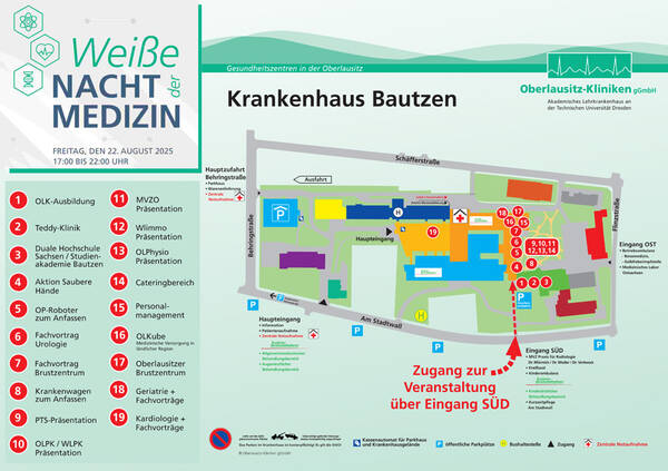 Am 22. August 2025 begrüßen wir Sie zur 1. Weißen Nacht der Medizin im Krankenhaus Bautzen. 17 Uhr geht's los - Treffpunkt und Zugang zur Veranstaltung ist der Eingang SÜD, über den Stadtwall zu erreichen. Nutzen Sie bitte für Ihre Anreise die öffentlichen Parkplätze rund um das Krankenhaus. Parkplätze Am Eingang SÜD werden Sie herzlich begrüßt. Rund 19 Stationen können Sie auf Ihrem Weg durch das Krankenhaus Bautzen erkunden: